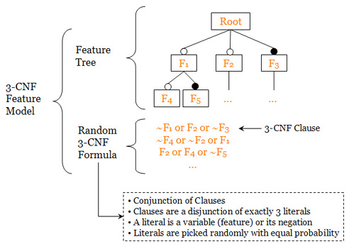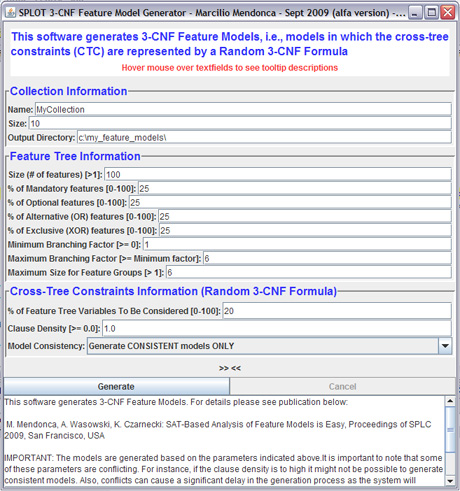 SPLOT Feature Model Generator generates 3-CNF Feature Models (3-CNF-FMs) (see explanation below) based on a set of input parameters. For details about 3-CNF-FMs and their relevance to Feature Modeling research, please check the following publication: